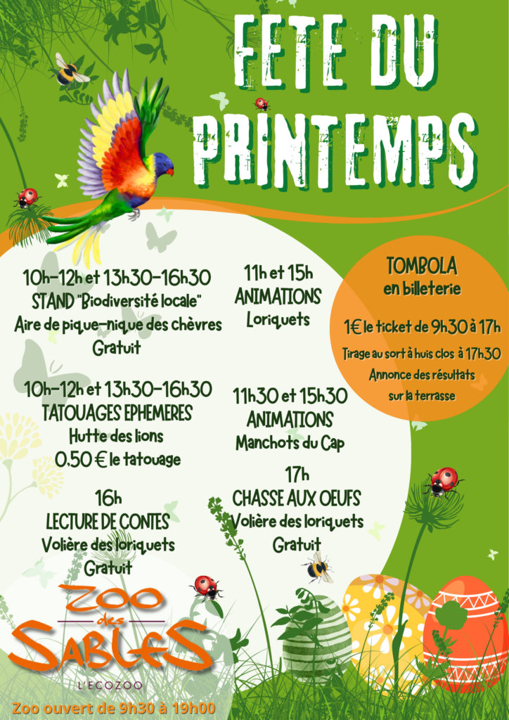 Mercredi 22 et jeudi 23 avril : Fête du Printemps Voir l'image agrandie Mercredi 22 et jeudi 23 avril 2026, c’est la fête du Printemps au zoo des Sables. Voici le programme : zoodessables2026-03-14T14:41:07+01:00Actualités, Evènements| Partagez cet article sur vos réseaux sociaux FacebookXRedditLinkedInTumblrPinterestEmail Articles connexes Mercredi 25 et jeudi 26 février : Le Carnaval des animaux Bonne année 2026 ! Ouverture pendant les vacances de Noël, du 20 décembre au 4 janvier ! Pause hivernale au Zoo des Sables ! Mercredi 29, jeudi 30 et vendredi 31 octobre 2025, c’est ZOOLLOWEEN au Zoo des Sables ! Bonne nouvelle !